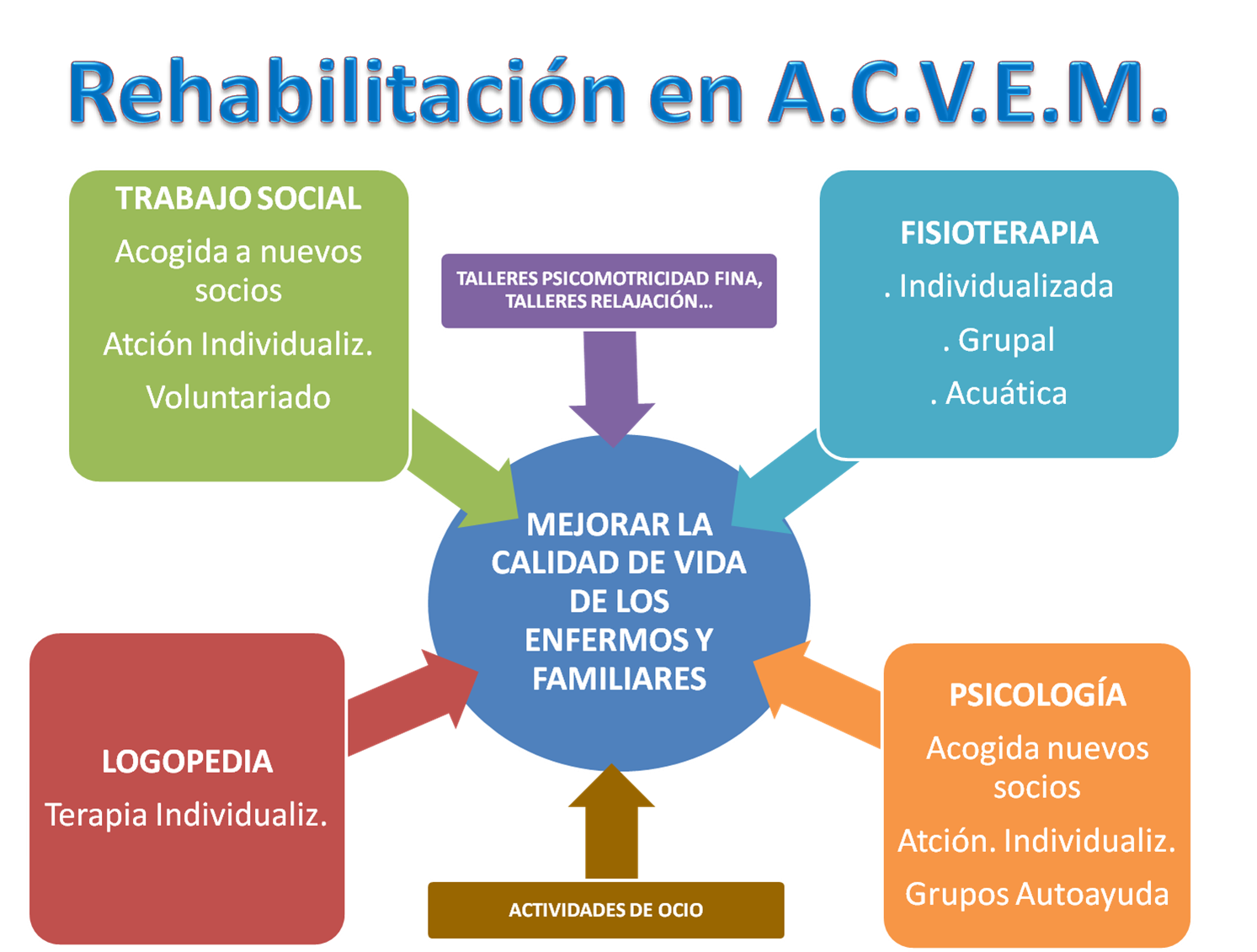 Desde sus comienzos hasta la actualidad, la asociación ha procurado poner en marcha aquellos servicios que las personas afectadas y sus familias necesitaban y no eran proporcionados por los poderes públicos, es por ello por lo que la mayoría de nuestros recursos se destinan al ÁREA DE REHABILITACIÓN que incluye los servicios de: psicología, trabajo social, logopedia y fisioterapia, así como la acogida al recién diagnosticado. Con todos ellos pretendemos complementar la atención que proporciona la sanidad pública (centrada en aspectos médicos y farmacológicos).